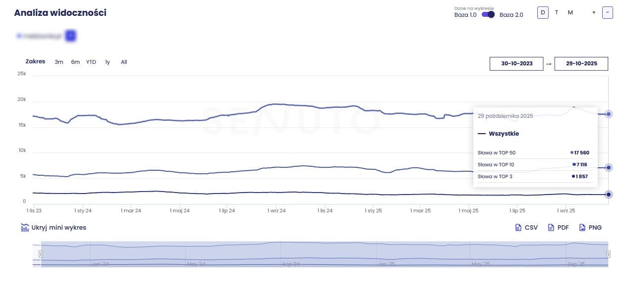 - TOP 50: stabilny wynik – utrzymanie i niewielki wzrost liczby fraz ogółem świadczy o poszerzaniu widoczności w dłuższym ogonie zapytań.